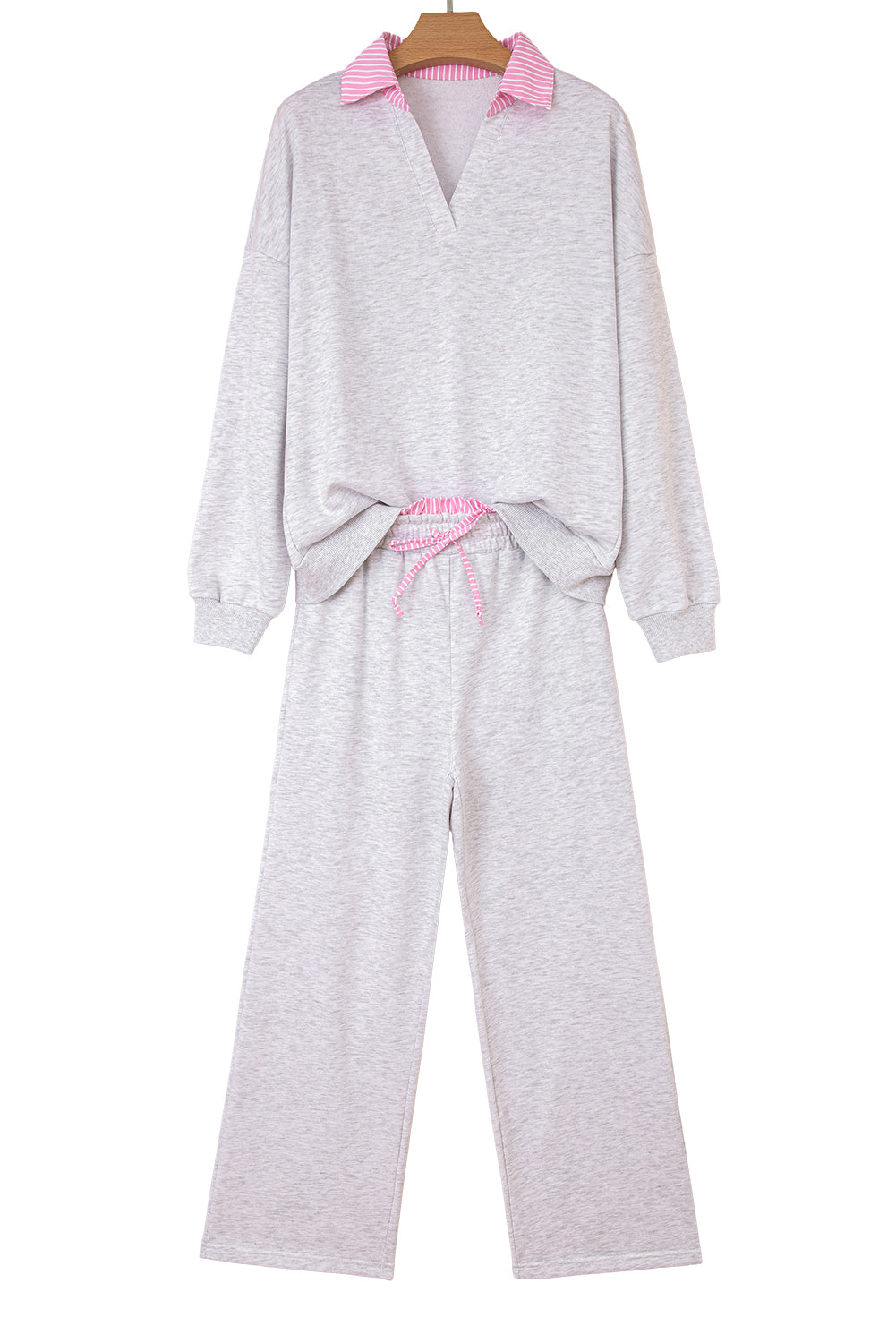 Light Grey Stripe Patchwork Loose Long Sleeve Top Drawstring Waist Pants Set