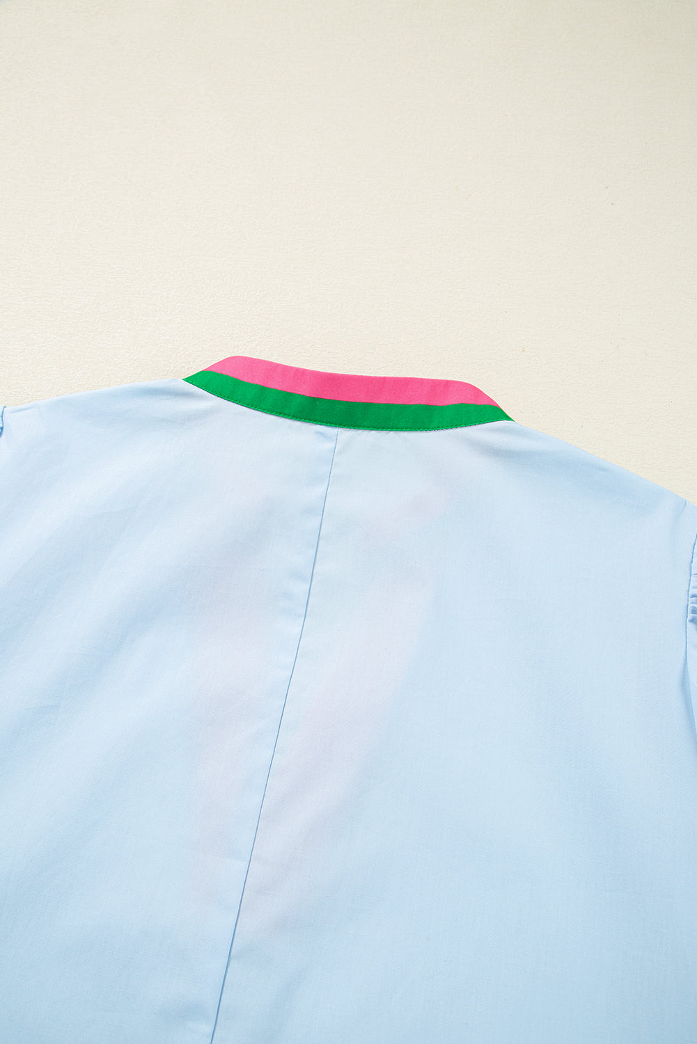 Striped Pop of Color V Neck Puff Sleeve Mini Dress